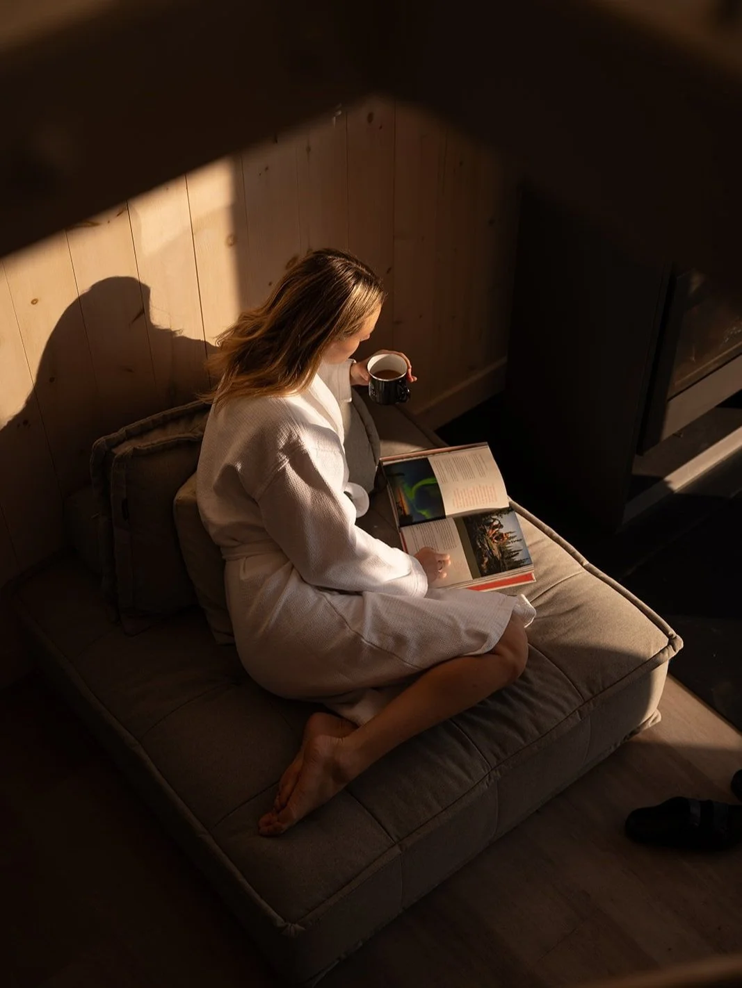 Ces chalets sur l’eau au design épuré invitent à la détente absolue. Profitez des embarcations nautiques (kayaks, planches à pagaie) à disposition sans frais pour explorer le lac, ou offrez-vous un moment de pure relaxation dans l’espace détente avec bains chauds extérieurs. À la tombée de la nuit, laissez-vous émerveiller par les étoiles de la Réserve internationale de ciel étoilé du Mont-Mégantic, confortablement installé autour d’un feu crépitant.